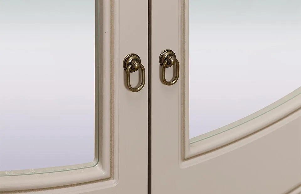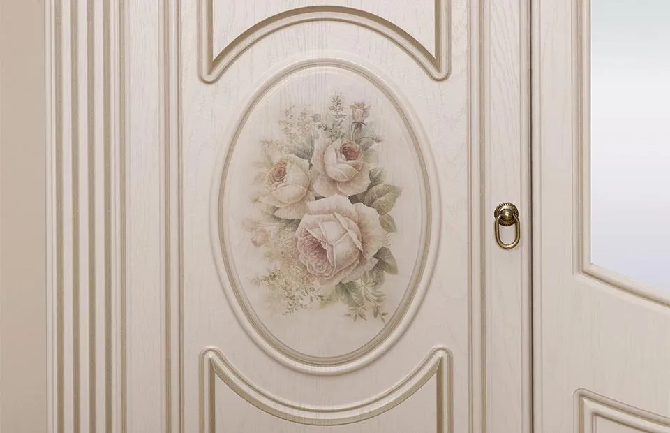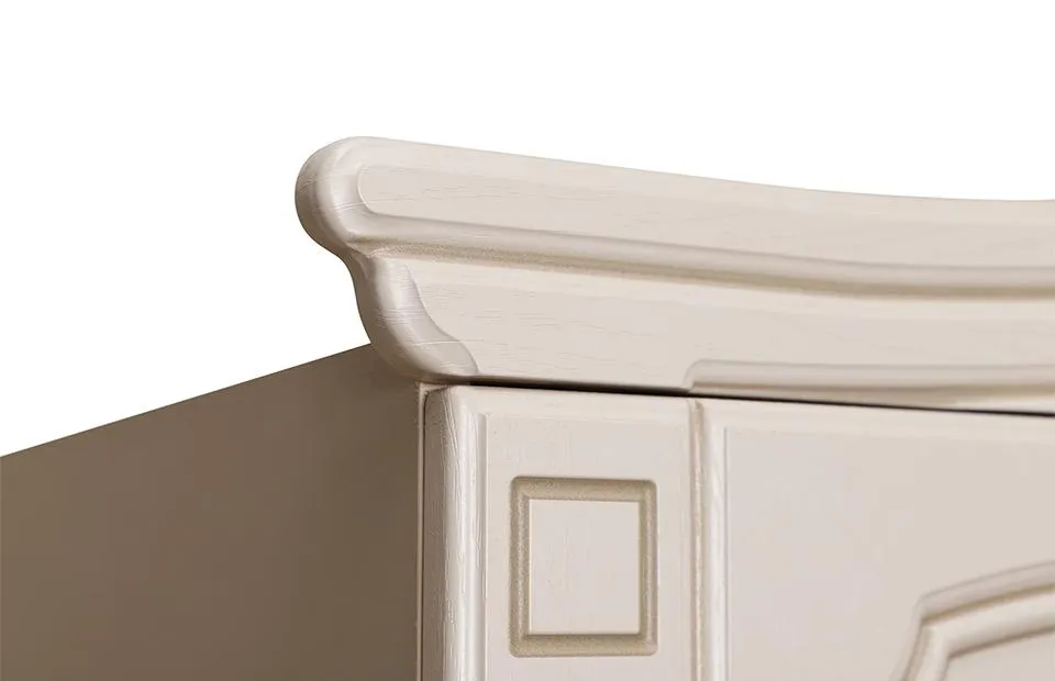 Фасады мебели декорированы элегантной фрезеровкой с эффектом патины и медальоном, на котором изображены розы. Для удобства использования дверцы и ящики оснащены темными металлическими ручками, имитирующими ковку.