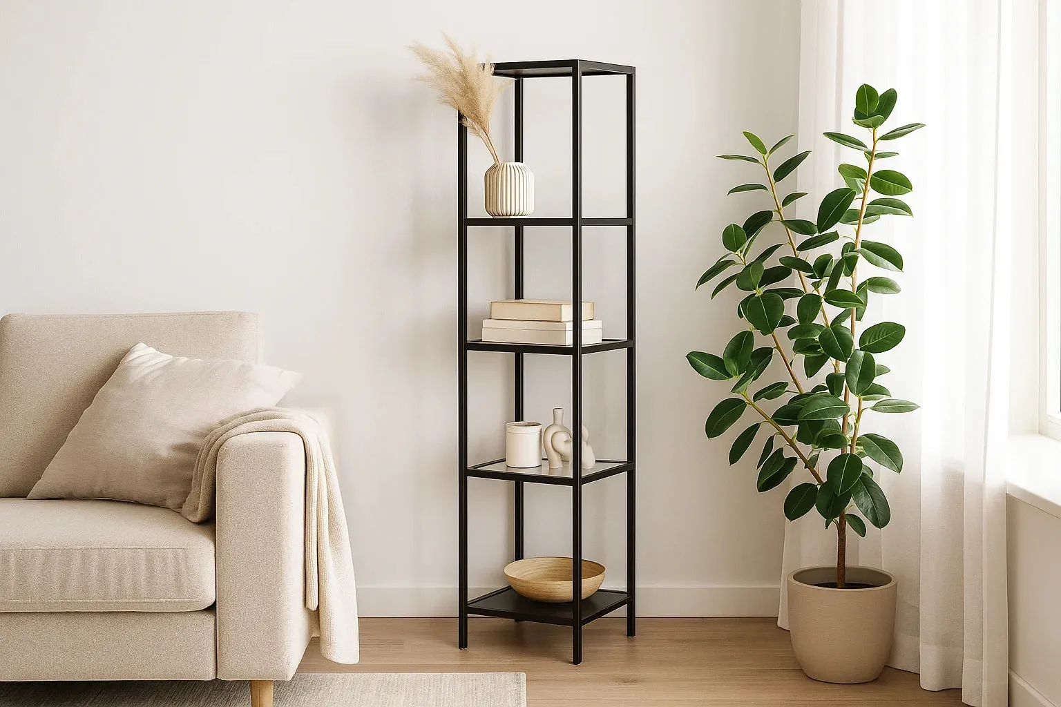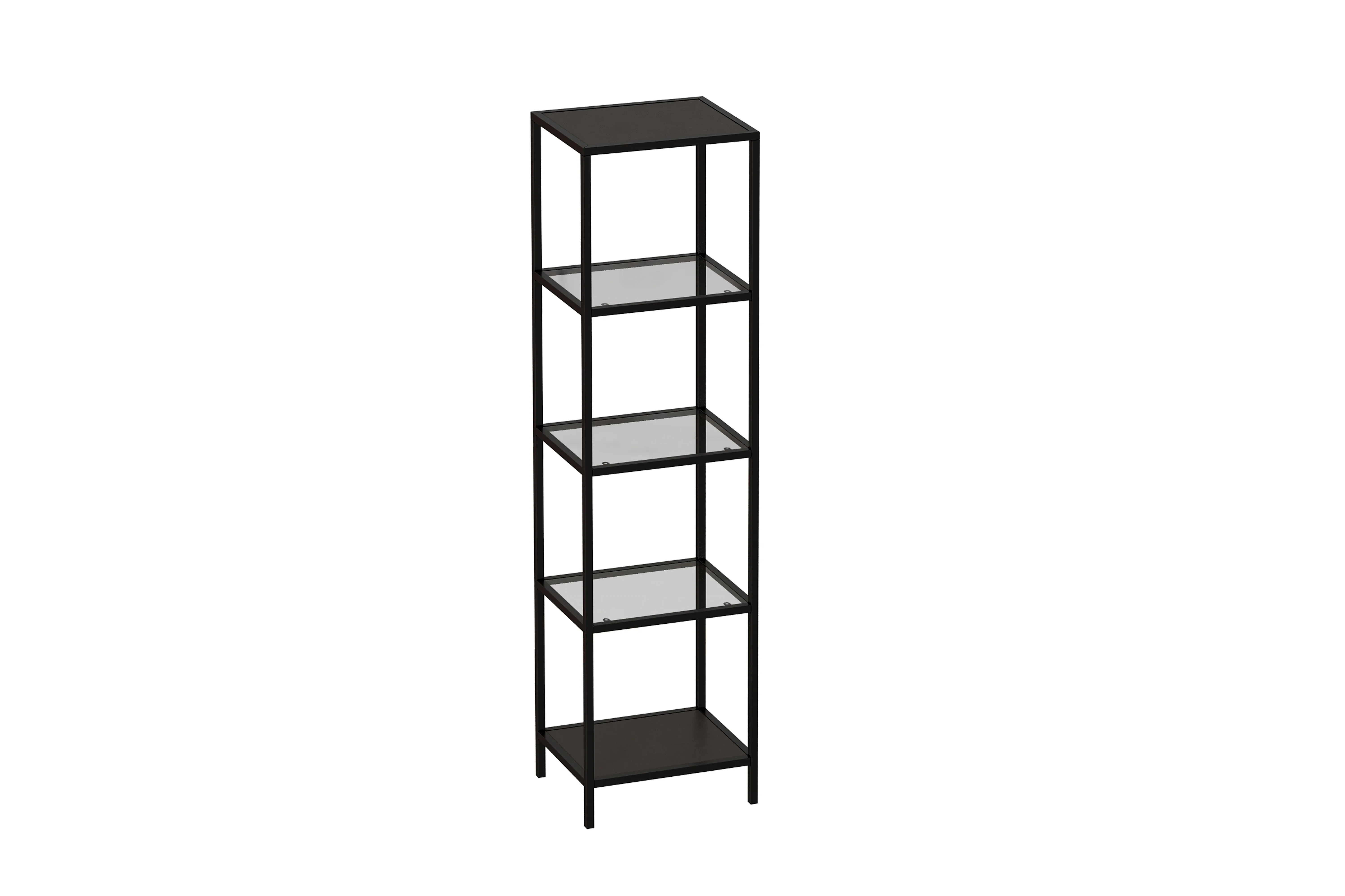 Стеллаж со стеклянными полками  "Нора". Опорой для стеллажа служит черный металлокаркас. Верхняя и нижние полки металлические. Средние выполнены из прозрачного стекла толщиной 5 мм. Опоры регулируются по высоте. Предусмотрены отверстия для фиксации к стене.