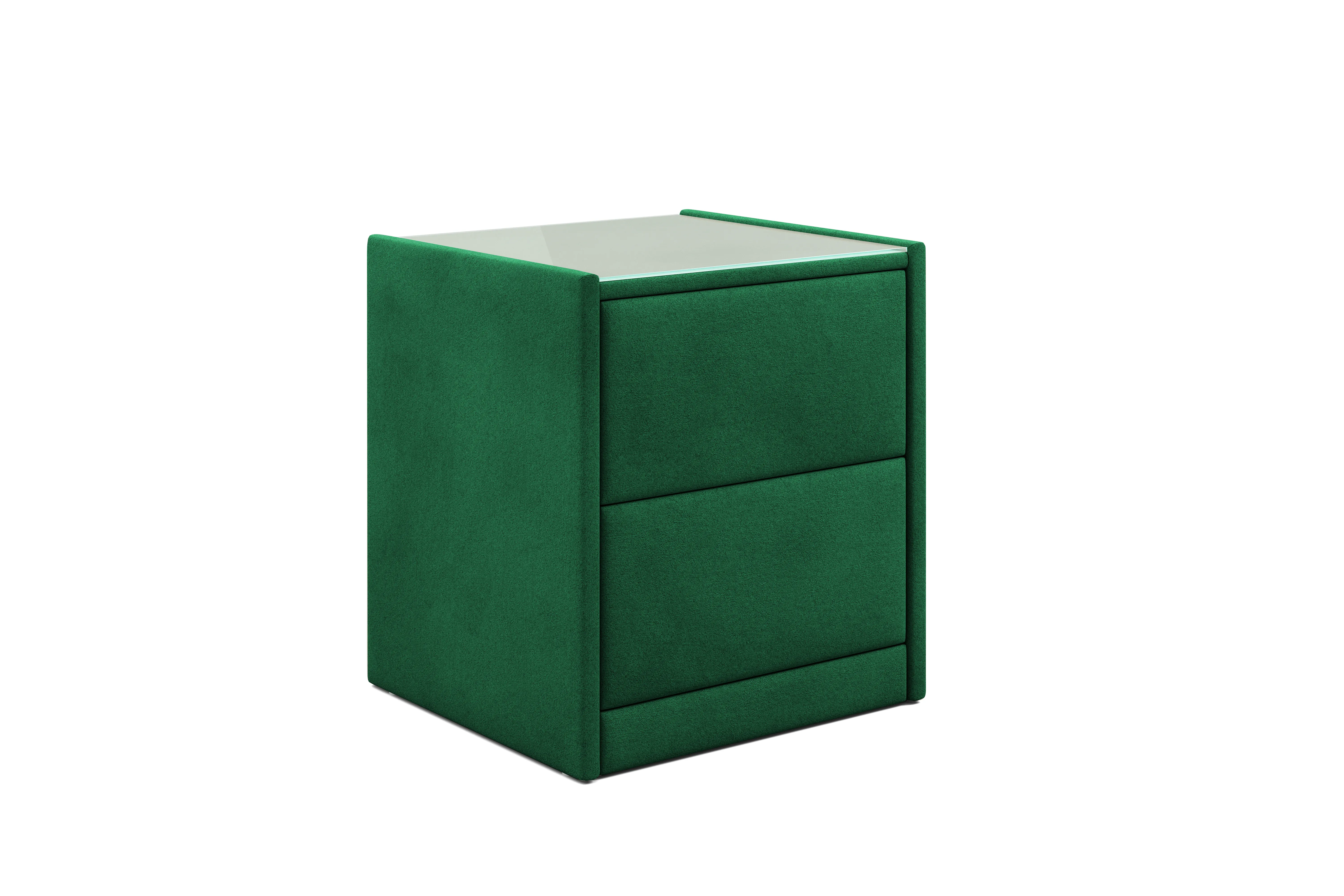 Тумба обтянута высококачественным велюром, что придает ей особый уют и комфорт. Имеет стеклянную столешницу и два вместительных выдвижных ящика с механизмом Push to open. Скругленные торцы модели, минимизируют риск удариться в темноте.