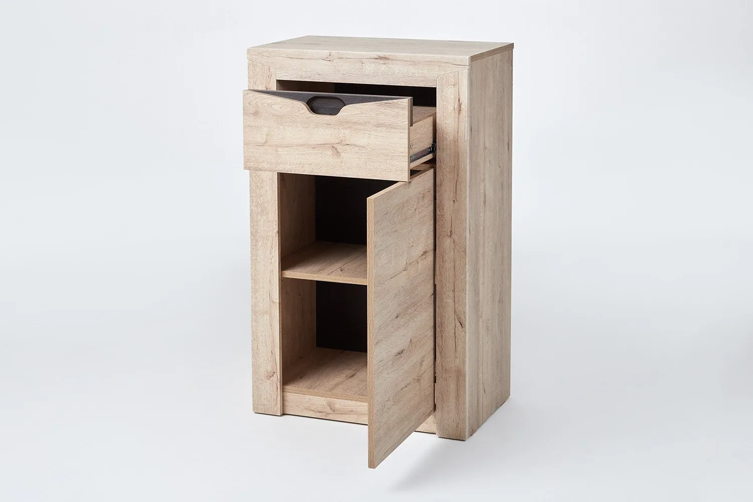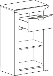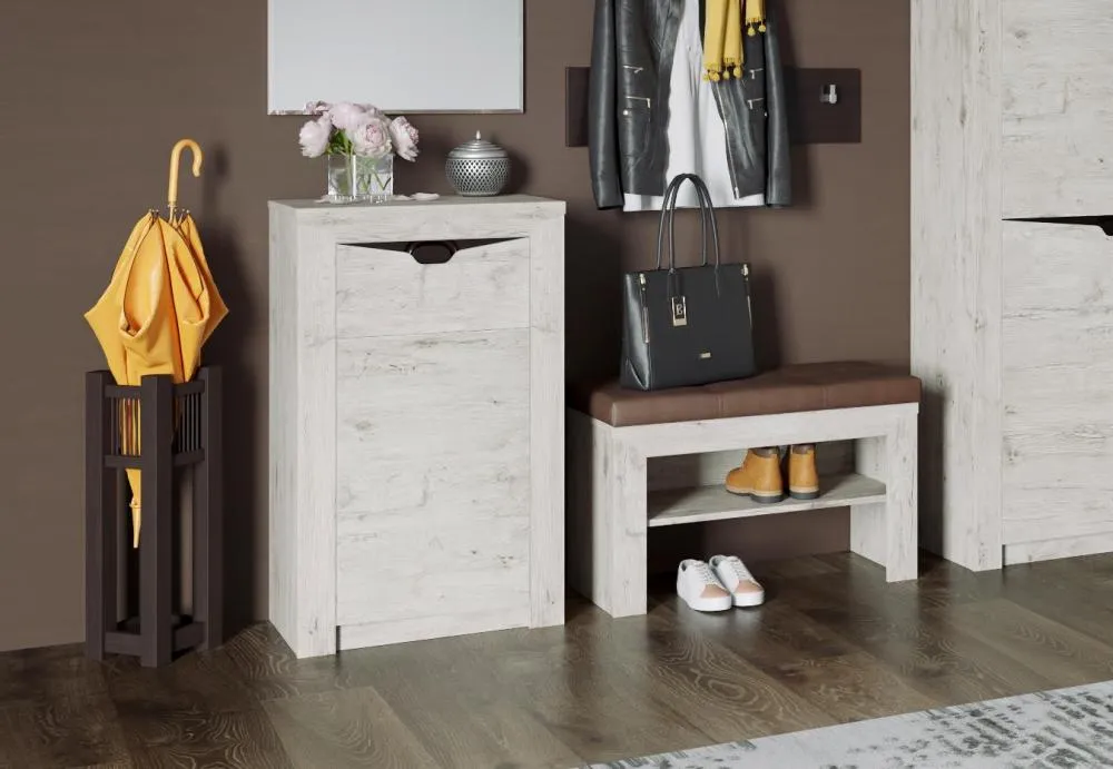 Тумба имеет распашную дверцу, за которой скрывается достаточно места для хранения обуви, а выдвижной ящик идеально подходит для хранения мелких предметов, таких как ключи, перчатки и шапки. Для открывания двери внутри устанавливается система Push to open открывающая ее после нажатия. На открытой полке можно разместить аксессуары или декор, чтобы добавить индивидуальности прихожей.