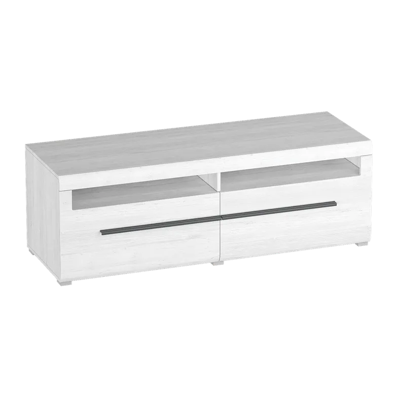 Корпус тумбы изготовлен из ЛДСП, фасады с закругленными линиями - из МДФ. Стиль изделия подчеркивают черные металлические ручки. Тумба имеет открытое отделение для хранения и два объемных выдвижных ящика на шариковых направляющих.